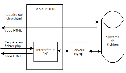- Dans le deuxième cas, un peu plus compliqué. Je suppose que je demande une page qui a besoin d'être fabriquée à partir de données qui sont en base de données. Cette page n'existe pas au format HTML sur le système de fichiers du serveur. Par contre, les informations nécessaires à sa fabrication sont stockées dans la base de données par MySQL. Dans ce cas, c'est le PHP qui va être sollicité pour interroger MySQL, récupérer les informations et 'fabriquer' le code HTML de la page en temps réel. Ensuite, comme dans le premier cas, le code HTML est envoyé au navigateur.
